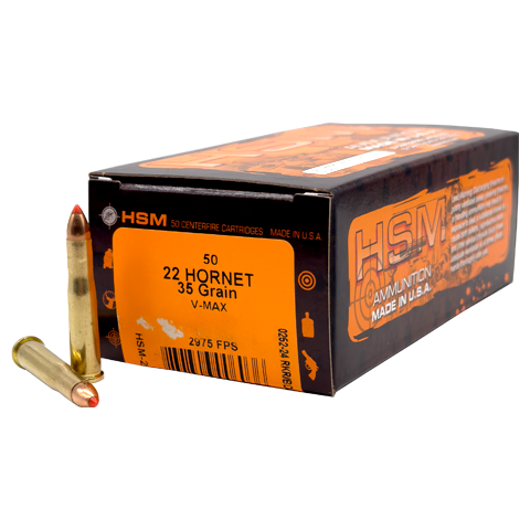 The HSM 22 Hornet 35 Grain V-MAX is a highly regarded ammunition choice for hunters and sport shooters who demand precision, reliability, and performance. Manufactured by the Hunting Shack Munitions (HSM), a company known for its dedication to quality and innovation in ammunition production, this particular cartridge stands out in the realm of small game and varmint hunting. HSM 22 Hornet is packaged in boxes of 50 Rounds.